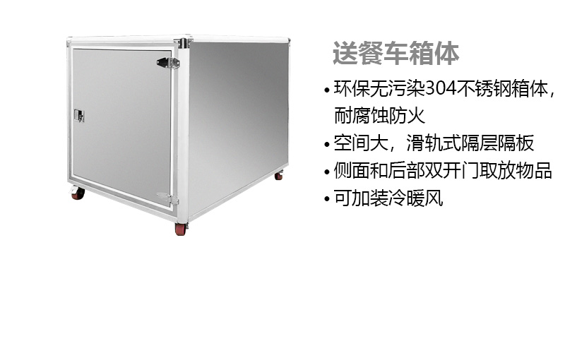 餐車(chē)箱體特點(diǎn):多種箱體材料可以選擇,保溫隔熱的加厚PP板、環(huán)保無(wú)污染的304不銹鋼材。箱體具有耐腐蝕防火特點(diǎn)??臻g大,滑軌式隔層隔板。 側面和后部雙 開(kāi)門(mén)方便用戶(hù) 取放物品。也可根據需要可 加裝冷暖風(fēng)。