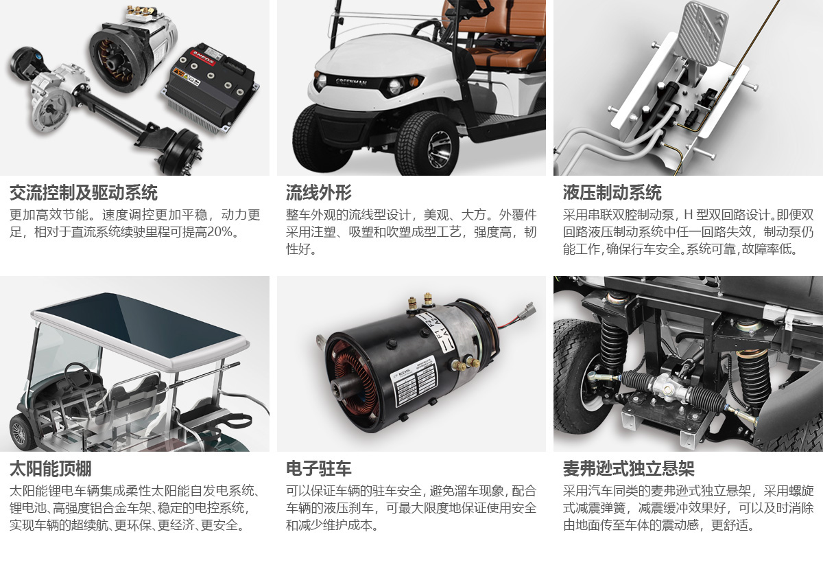 六座接待車(chē)性能穩定、操控輕便, 實(shí)用于高爾夫球場(chǎng)、大型游樂(lè )園、高檔酒店等。